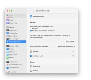 • در صورت دریافت پیام Damaged در مراحل اجرای فایل‌ها به تنظیمات مکینتاش به مسیر Setting Privacy & Security رفته OpenAnyway بزنید.